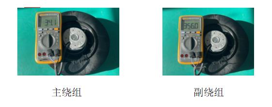 首先,使用萬(wàn)用表測(cè)量風(fēng)機(jī)主副繞組電阻并分析如下:主繞組電阻實(shí)測(cè)34.1Ω,正常范圍是30.09-40.71Ω,主繞組電阻合格;副繞組實(shí)測(cè) 356Ω,正常范圍是28.9-39.1Ω,副繞組電阻不合格。
