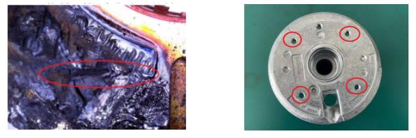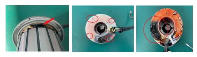 根據(jù)以上分析,風(fēng)機(jī)焦糊味為客戶使用過(guò)長(zhǎng)安裝螺絲導(dǎo)致連接板棕線連接處受力斷裂、打火燒毀所產(chǎn)生。我公司強(qiáng)烈建議客戶安裝風(fēng)機(jī)時(shí)使用適宜長(zhǎng)度安裝螺絲,而且我們的電機(jī)上有標(biāo)注螺絲孔深度,以確保風(fēng)機(jī)正常運(yùn)行。